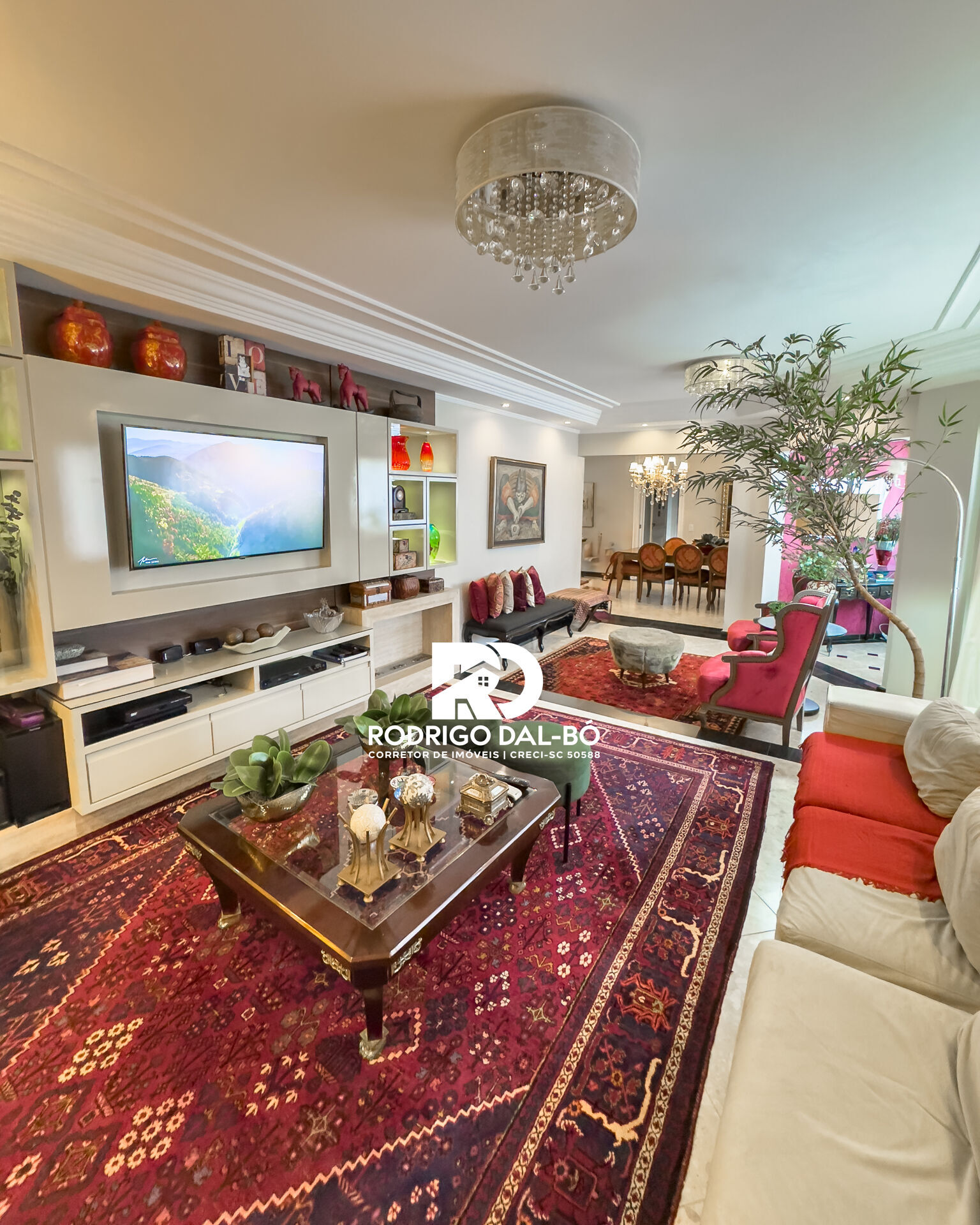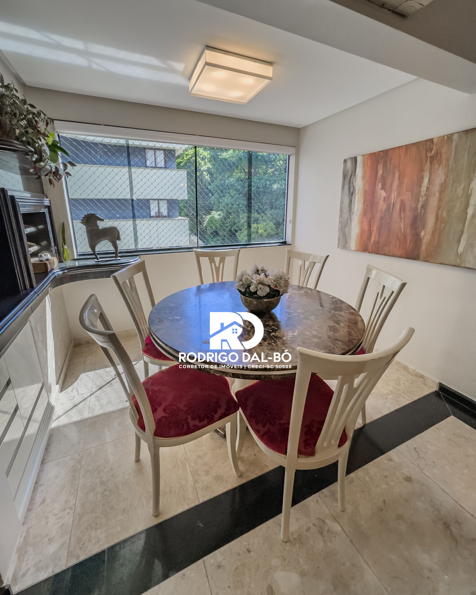 - Sala de estar e jantar integradas, com piso em mármore